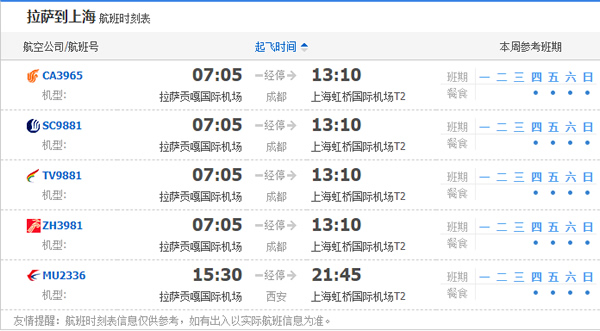 以上就是拉薩飛上海的航班時(shí)刻表,起飛時(shí)間,到達(dá)時(shí)間,及固定航班日期。