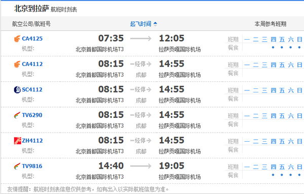 以上就是北京飛拉薩的航班時刻表,起飛時間,到達時間,及固定航班日期。